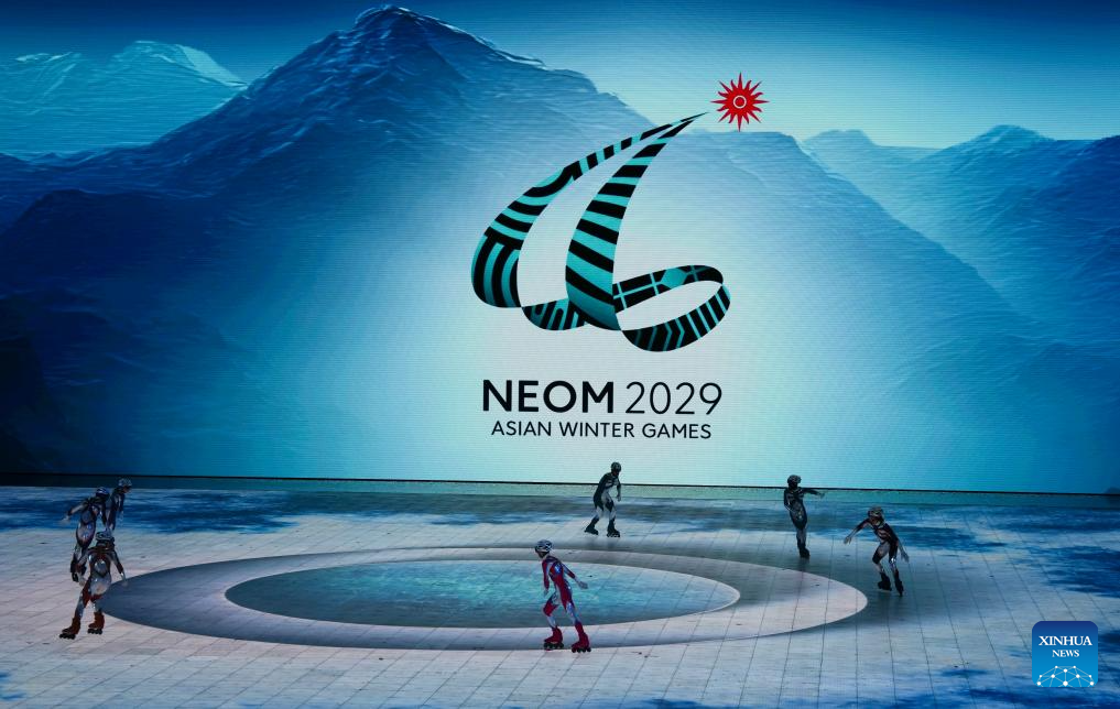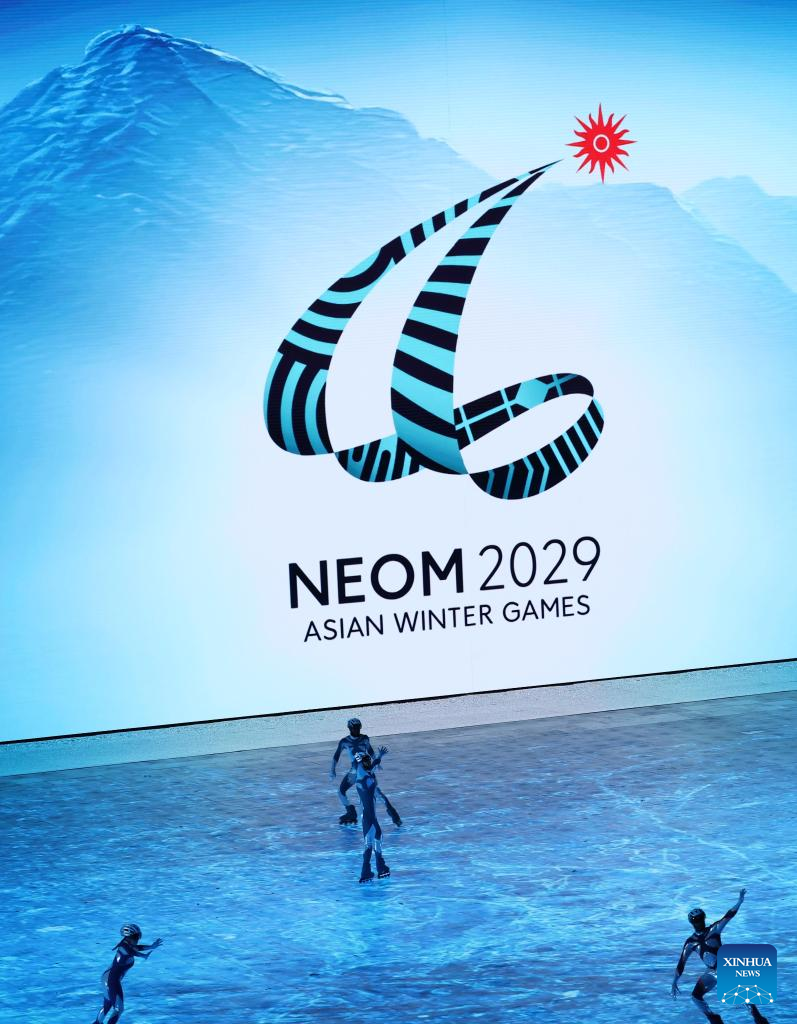A screen showing the name and sign of the 10th Asian Winter Games host city Neom of Saudi Arabia is seen during the closing ceremony of the 9th Asian Winter Games in Harbin, northeast China's Heilongjiang Province, Feb. 14, 2025. (Xinhua/Xu Yanan)