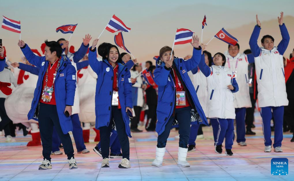 Delegation members of Thailand and the Democratic People's Republic of Korea attend the closing ceremony of the 9th Asian Winter Games in Harbin, northeast China's Heilongjiang Province, Feb. 14, 2025. (Xinhua/Zhang Tao)