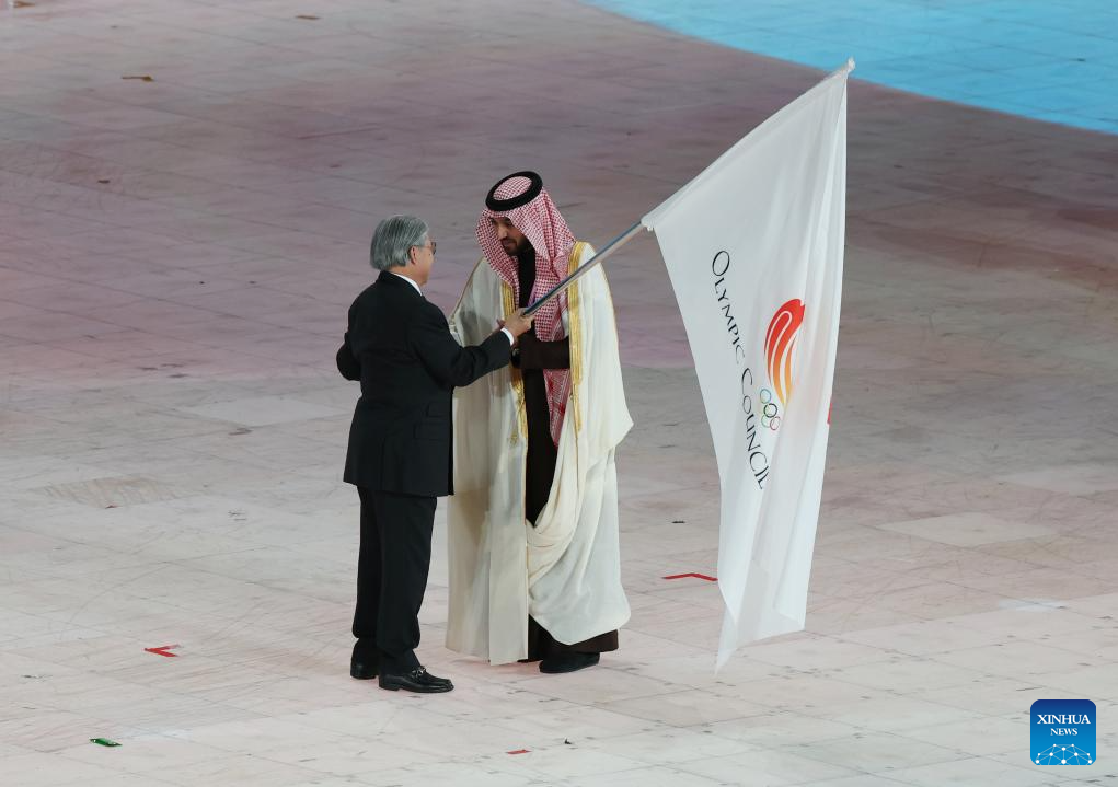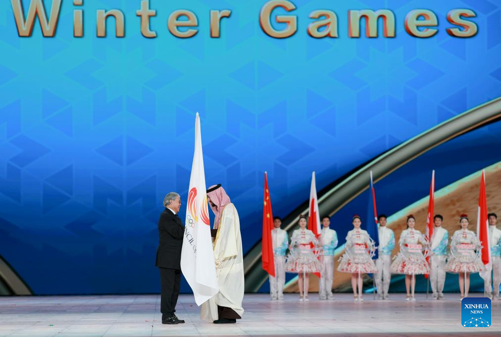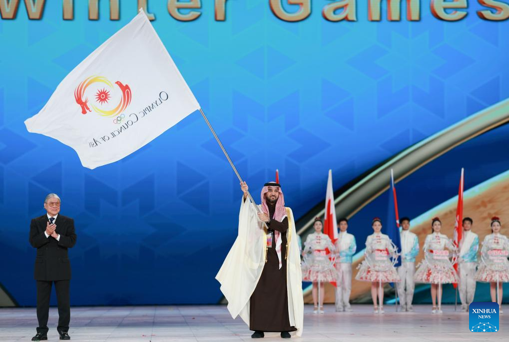 The Olympic Council of Asia (OCA) flag handover ceremony is seen during the closing ceremony of the 9th Asian Winter Games in Harbin, northeast China's Heilongjiang Province, Feb. 14, 2025. (Xinhua/Xu Yanan)