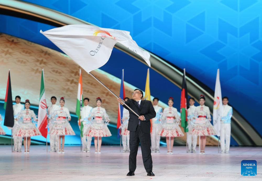The Olympic Council of Asia (OCA) flag handover ceremony is seen during the closing ceremony of the 9th Asian Winter Games in Harbin, northeast China's Heilongjiang Province, Feb. 14, 2025. (Xinhua/Zhang Tao)