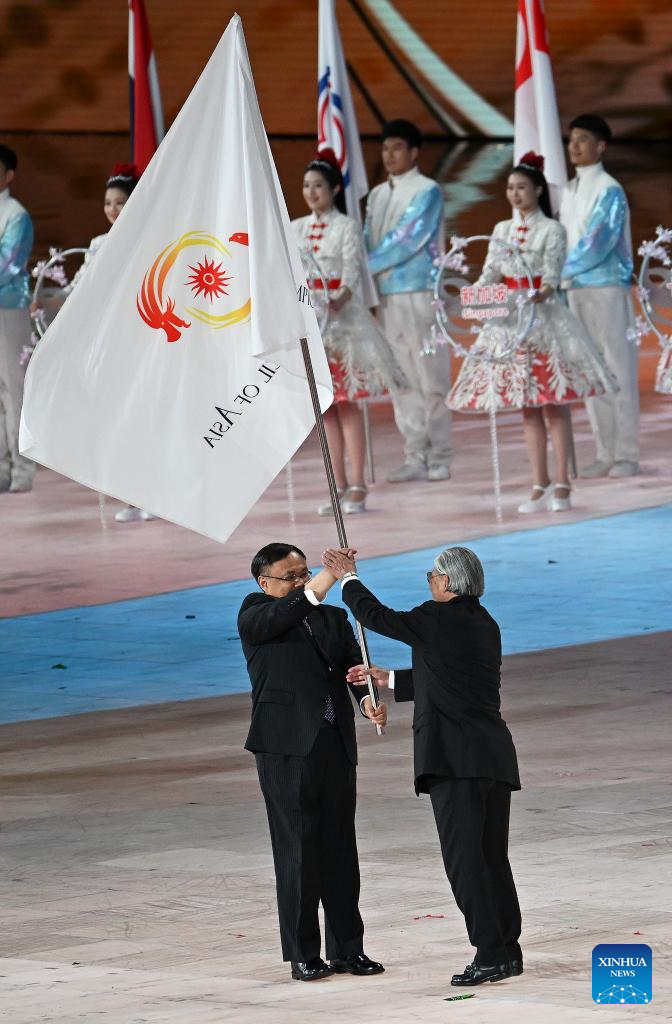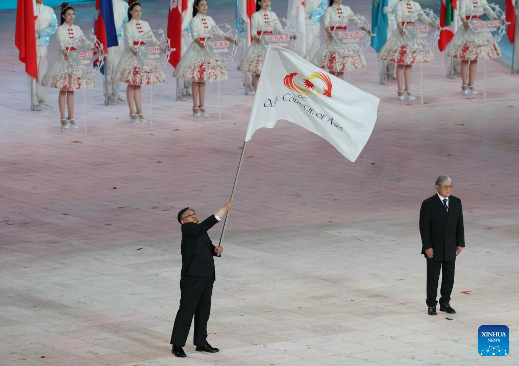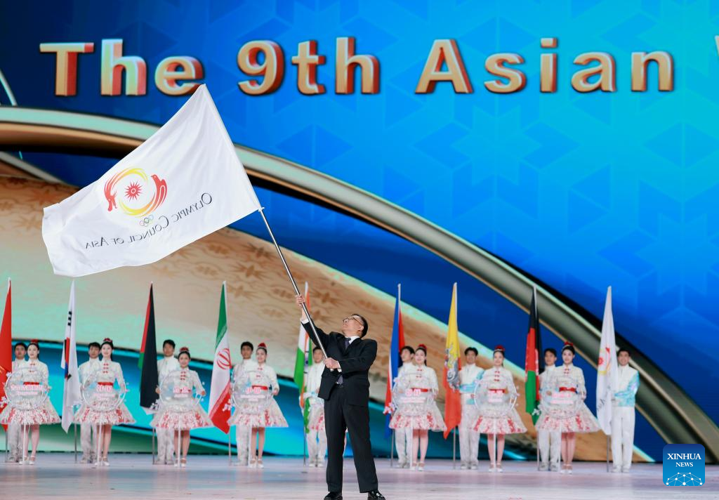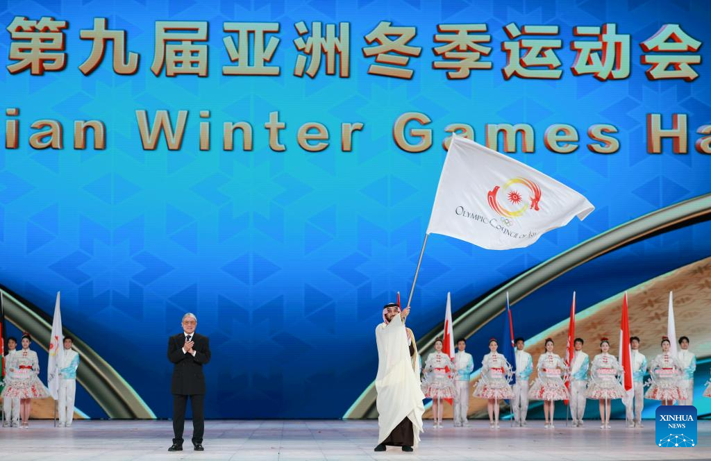 The Olympic Council of Asia (OCA) flag handover ceremony is seen during the closing ceremony of the 9th Asian Winter Games in Harbin, northeast China's Heilongjiang Province, Feb. 14, 2025. (Xinhua/Wang Jianwei)