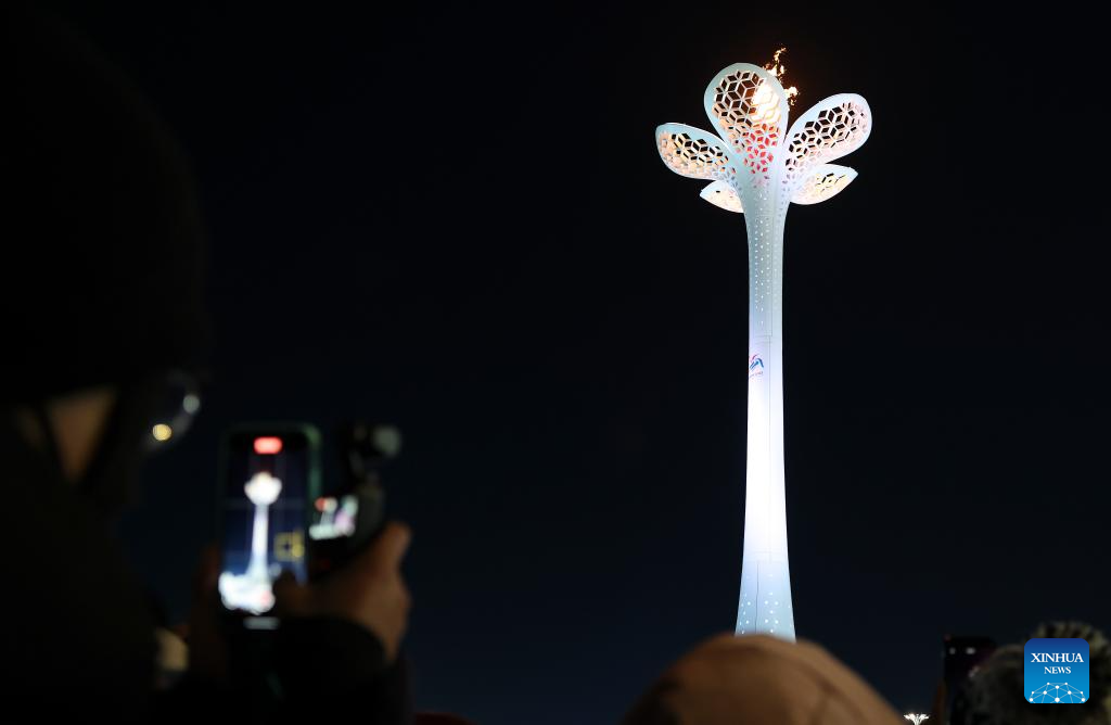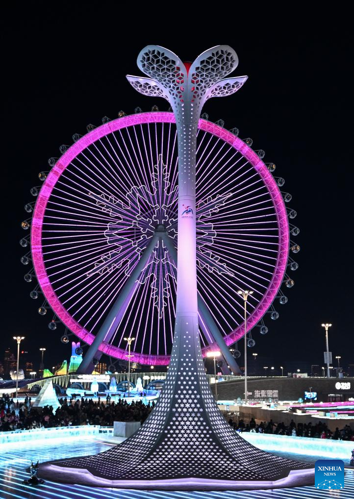 The cauldron is seen at Harbin Ice and Snow World Park during the closing ceremony of the 9th Asian Winter Games in Harbin, northeast China's Heilongjiang Province, Feb. 14, 2025. (Xinhua/Huang Wei)