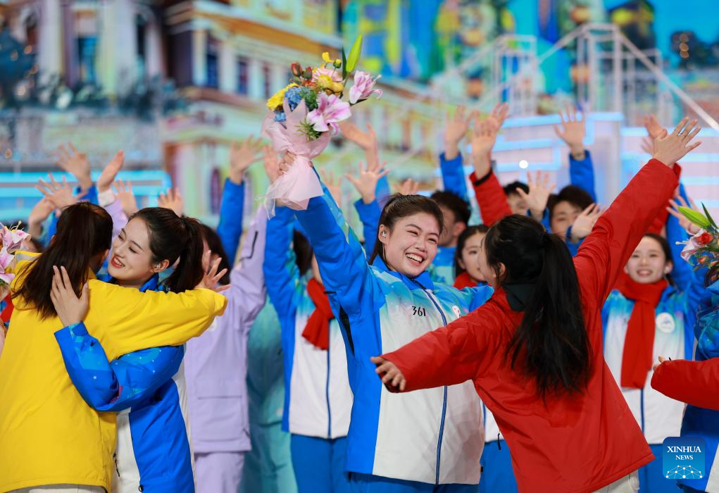 Freestyle skier and Olympic champion Xu Mengtao, who secured two gold medals and a silver in Harbin, carried the flag for the Chinese delegation during the closing ceremony.