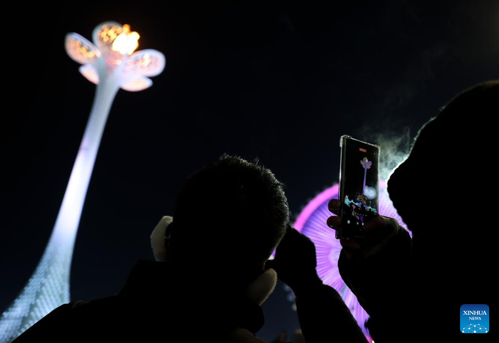A tourist records the extinguishing of the cauldron during the closing ceremony of the 9th Asian Winter Games in Harbin, northeast China's Heilongjiang Province, Feb. 14, 2025. (Xinhua/Huang Wei)