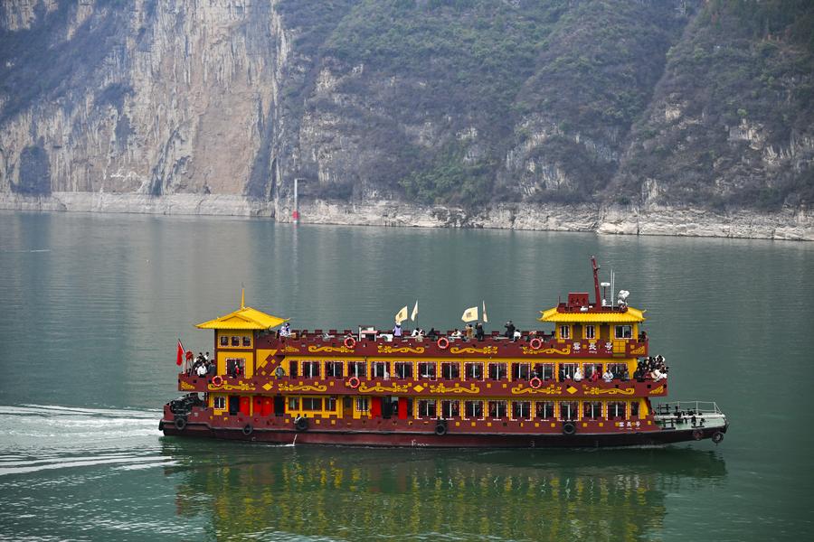 Tourists take a cruise ship to visit Qutang Gorge, one of the Three Gorges on the Yangtze River, in Fengjie County, southwest China's Chongqing Municipality, Feb. 13, 2025. (Xinhua/Wang Quanchao)