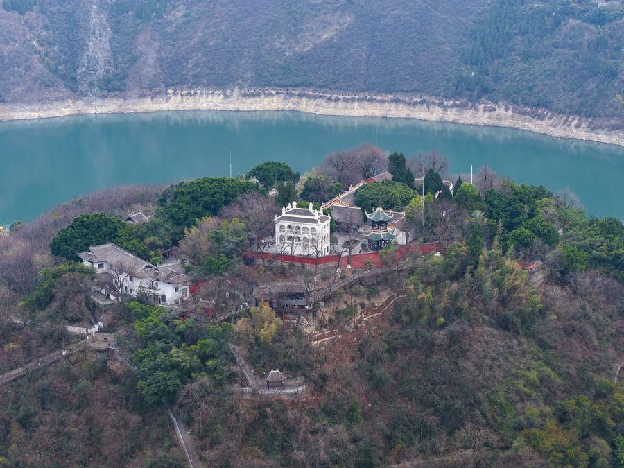 An aerial drone photo taken on Feb. 13, 2025 shows the scenery around the ancient town of Baidi and Qutang Gorge, one of the Three Gorges on the Yangtze River, in Fengjie County, southwest China's Chongqing Municipality. (Photo by Zhu Song/Xinhua)