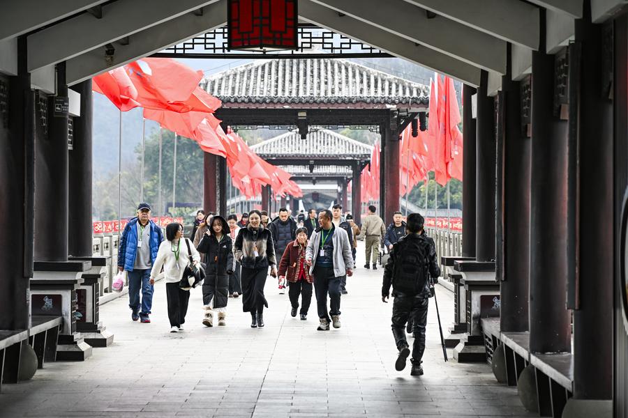 Tourists visit the ancient town of Baidi in Fengjie County, southwest China's Chongqing Municipality, Feb. 13, 2025. (Xinhua/Wang Quanchao)