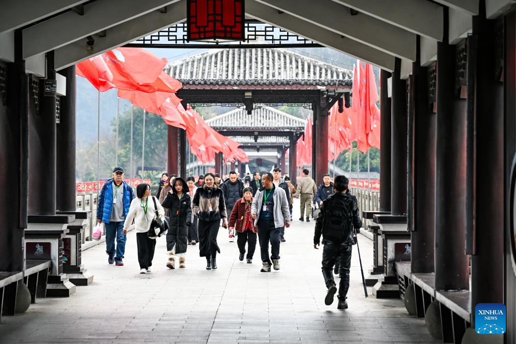 Tourists visit the ancient town of Baidi in Fengjie County, southwest China's Chongqing Municipality, Feb. 13, 2025. Fengjie, a county in Chongqing where the Kuimen gateway to the magnificent gorges of the Yangtze River is located, gained its reputation as the "city of poetry," as poets, military figures and politicians in history wrote extensively about the forbidding landscape of rapid currents and narrow waterways.