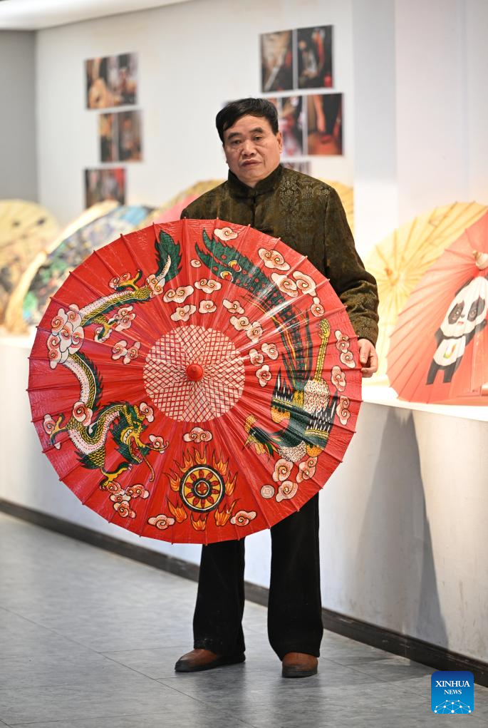 Bi Liufu shows an oil-paper umbrella with traditional patterns in Fenshuiling Town of Luzhou City, southwest China's Sichuan Province, Feb. 11, 2025. (Xinhua/Liu Kun)