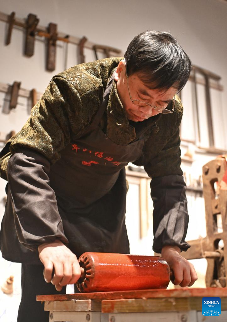 Bi Liufu prints a pattern of oil-paper umbrella with a stone plate in Fenshuiling Town of Luzhou City, southwest China's Sichuan Province, Feb. 11, 2025. (Xinhua/Liu Kun)