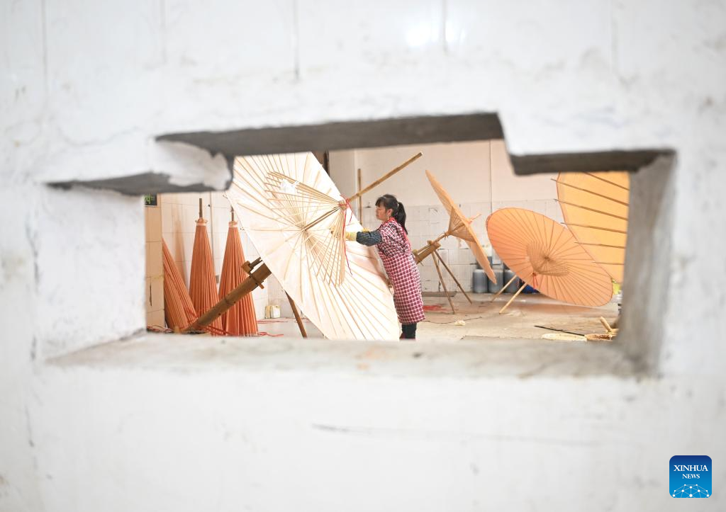 A craftswoman makes an oil-paper umbrella in Fenshuiling Town of Luzhou City, southwest China's Sichuan Province, Feb. 11, 2025. (Xinhua/Liu Kun)