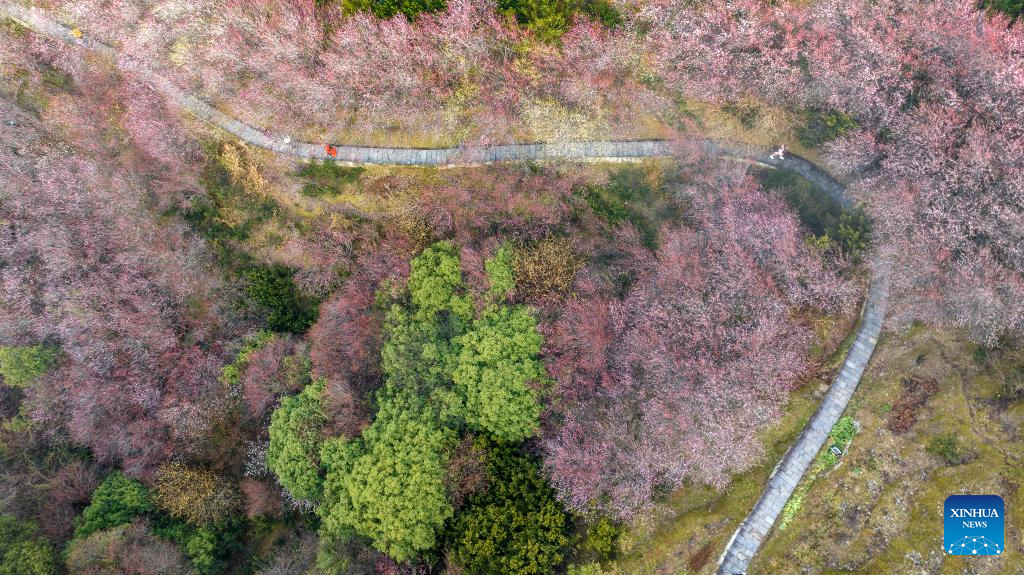 This aerial drone photo taken on Feb. 16, 2025 shows the plum blossoms at a village in Shexian County, Huangshan City, east China's Anhui Province. (Photo by Fan Chengzhu/Xinhua)