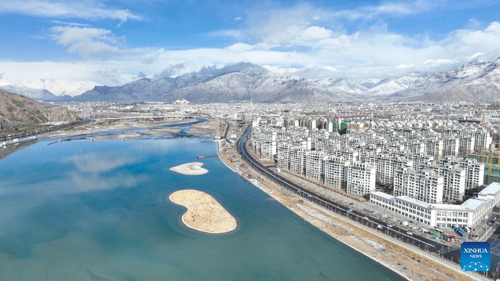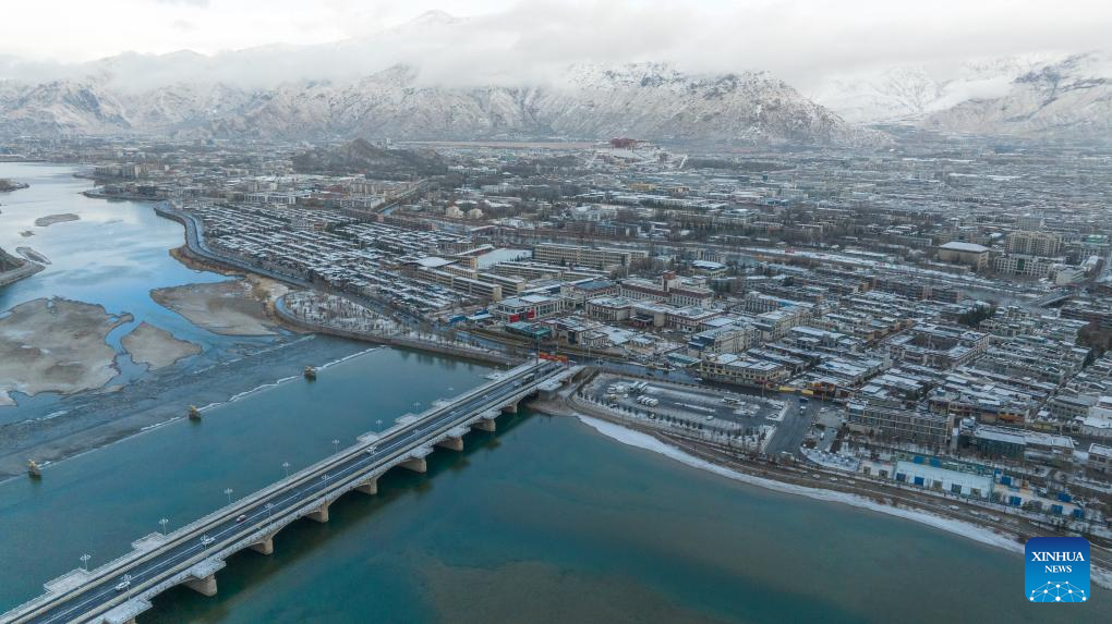 An aerial drone photo taken on Feb. 16, 2025 shows the snow scenery in Lhasa, southwest China's Xizang Autonomous Region. (Xinhua/Tenzin Nyida)