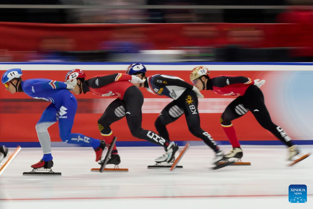(L to R) Pietro Sighel of Italy, Sun Long of China, Jang Sungwoo of South Korea and Liu Shaoang of China compete during the men's 1000m final A at the ISU Short Track World Tour 2024/2025 in Milan, Italy, Feb. 16, 2025. (Xinhua/Meng Dingbo)