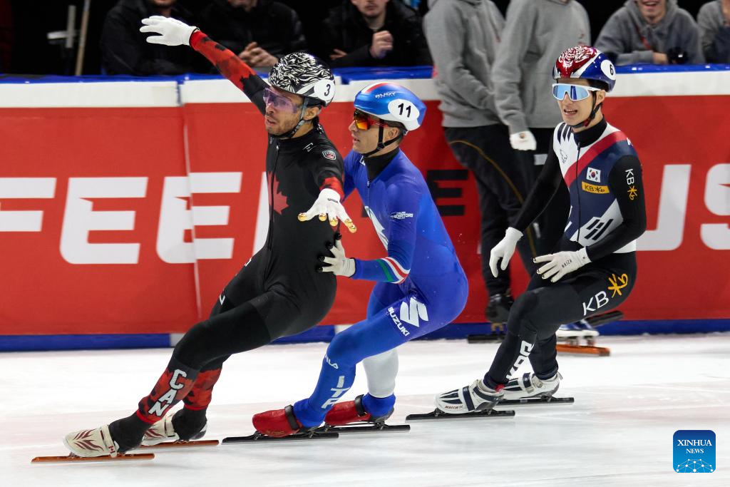 William Dandjinou (L) of Canada crosses the finish line as Pietro Sighel (C) of Italy and Jang Sungwoo of South Korea follow during the men's 1000m final A at the ISU Short Track World Tour 2024/2025 in Milan, Italy, Feb. 16, 2025. (Xinhua/Meng Dingbo)