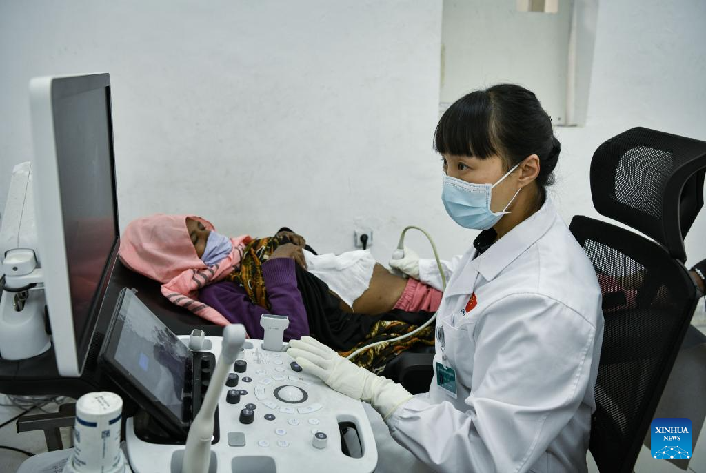 Chinese doctor Li Juan, a member of the 25th Chinese medical team dispatched to Ethiopia, performs an ultrasound examination for a patient at the Tirunesh Beijing General Hospital in Addis Ababa, Ethiopia, Feb. 14, 2025. The 25th Chinese medical team dispatched to Ethiopia arrived in the country in May 2024 and has been providing medical services for local patients and training for local doctors. The Tirunesh Beijing General Hospital was also built as part of long-standing assistance efforts of the Chinese government. (Xinhua/Han Xu)