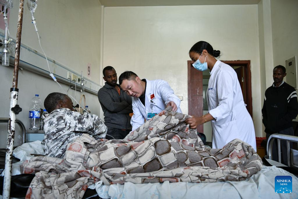 Chinese doctor Shang Chenguang, a member of the 25th Chinese medical team dispatched to Ethiopia, conducts a ward round at the Tirunesh Beijing General Hospital in Addis Ababa, Ethiopia, Feb. 14, 2025. The 25th Chinese medical team dispatched to Ethiopia arrived in the country in May 2024 and has been providing medical services for local patients and training for local doctors. The Tirunesh Beijing General Hospital was also built as part of long-standing assistance efforts of the Chinese government. (Xinhua/Han Xu)