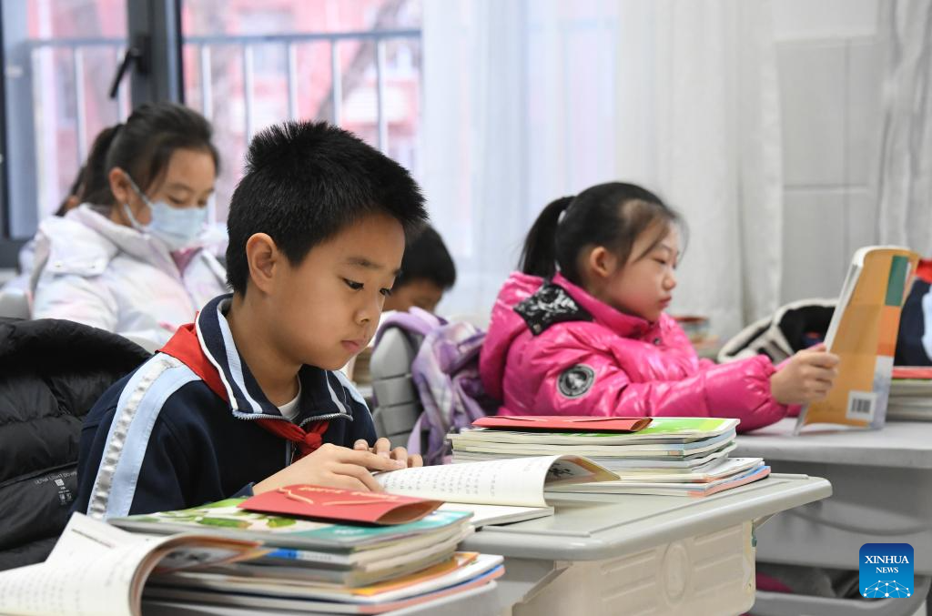 Students read books at a classroom of a primary school in Haidian District, in Beijing, capital of China, Feb. 17, 2025. The new semester for primary and secondary schools kicked off in many parts of China on Monday. (Xinhua/Ren Chao)