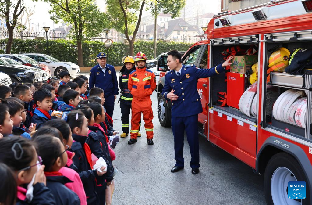 A firefighter introduces a fire fighting truck to students at a school in Changning District of Shanghai, east China, Feb. 17, 2025. With a mixture of nerves and excitement, many students in China attended their special first class of new semester. (Xinhua/Fang Zhe)