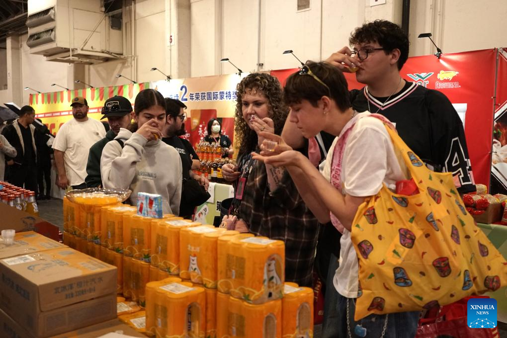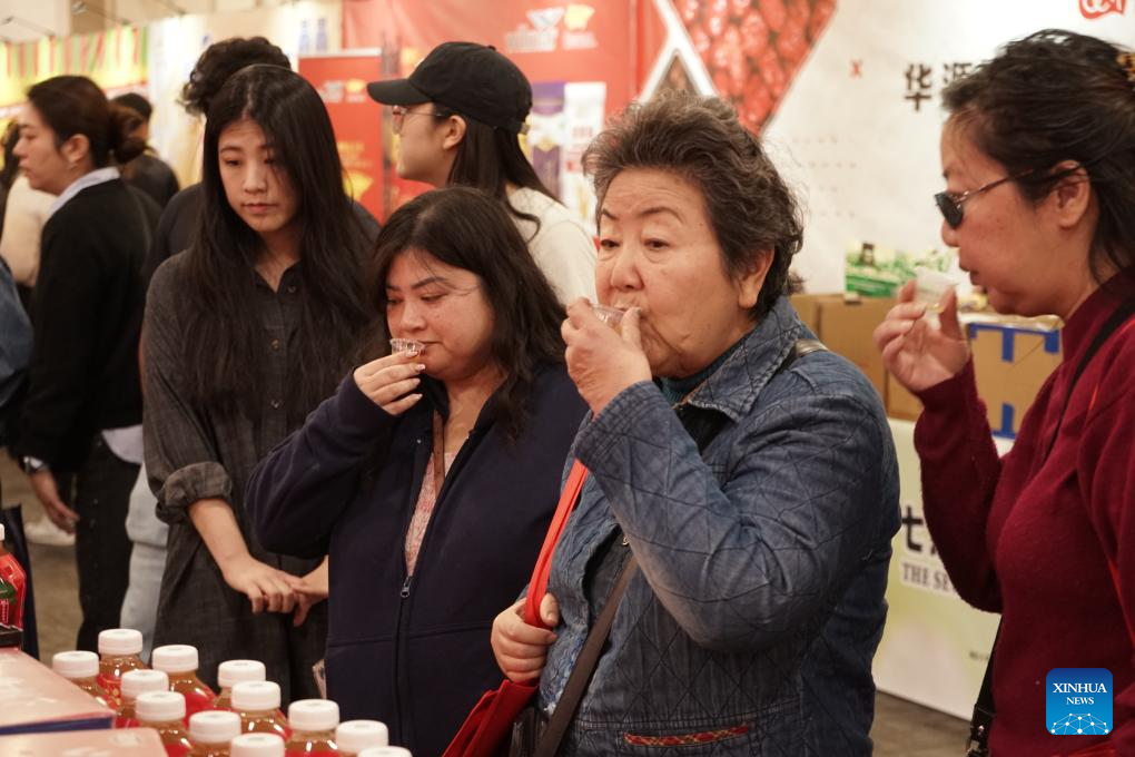 People taste drinks produced by a Chinese company during the seventh Authentic Asian Food Expo in Pomona city, California, the United States, on Feb. 15, 2025. (Photo by Zeng Hui/Xinhua)