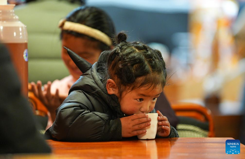 A child enjoys buttered tea at a Tibetan-style teahouse in Seni District of Nagqu, southwest China's Xizang Autonomous Region, Feb. 13, 2025. Covering an area of around 1,200 square meters, the Tibetan-style teahouse presents customers with both Tibetan delicacies and immersive experiences of folklore culture. Themed over 3,000 pieces of traditional Tibetan folk artifacts, the teahouse offers a lens through which people can learn about the northern Xizang nomadic culture. (Xinhua/Jigme Dorje)