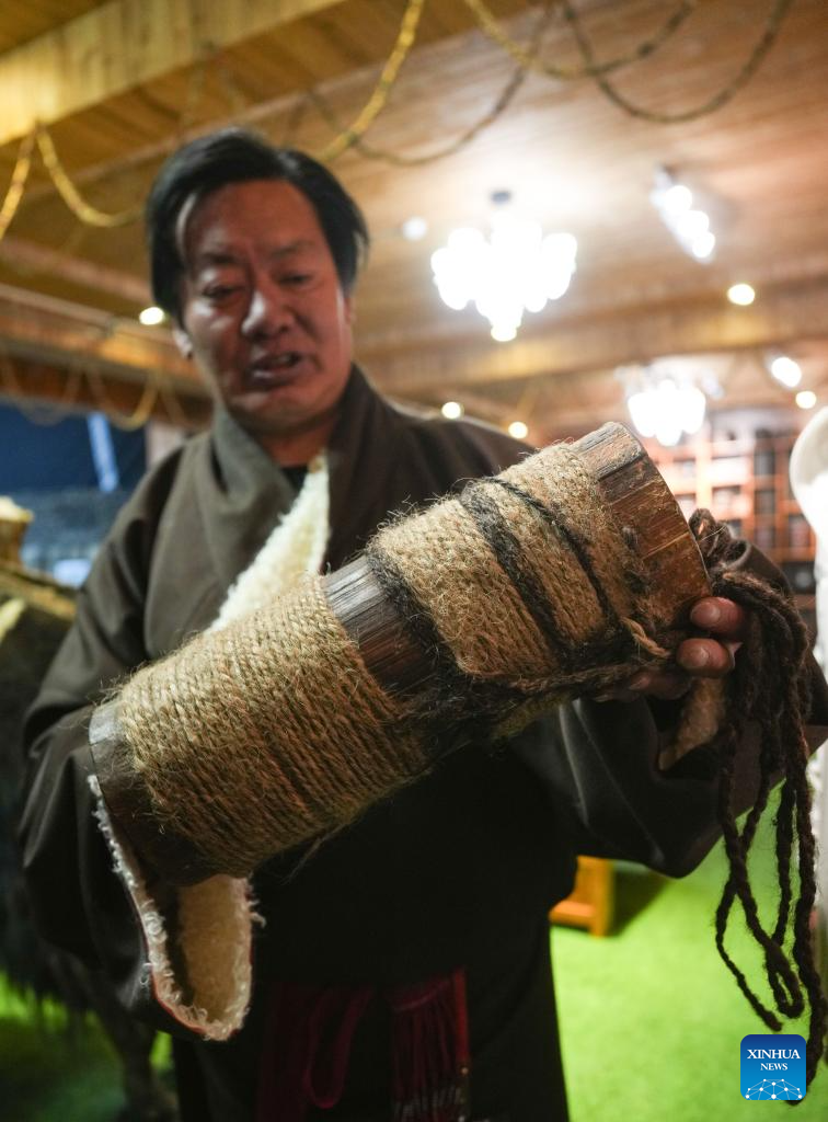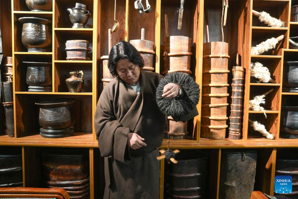 Drup Drup, owner of a Tibetan-style teahouse, demonstrates a spinning tool in Seni District of Nagqu, southwest China's Xizang Autonomous Region, Feb. 13, 2025. Covering an area of around 1,200 square meters, the Tibetan-style teahouse presents customers with both Tibetan delicacies and immersive experiences of folklore culture. Themed over 3,000 pieces of traditional Tibetan folk artifacts, the teahouse offers a lens through which people can learn about the northern Xizang nomadic culture. (Xinhua/Jigme Dorje)