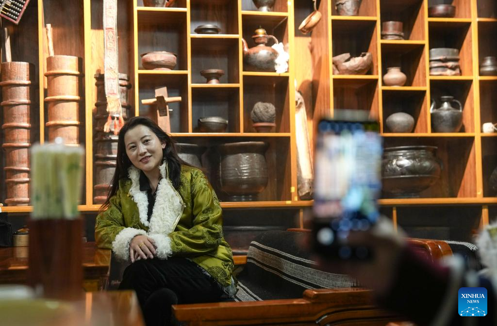 A woman poses at a Tibetan-style teahouse in Seni District of Nagqu, southwest China's Xizang Autonomous Region, Feb. 13, 2025. Covering an area of around 1,200 square meters, the Tibetan-style teahouse presents customers with both Tibetan delicacies and immersive experiences of folklore culture. Themed over 3,000 pieces of traditional Tibetan folk artifacts, the teahouse offers a lens through which people can learn about the northern Xizang nomadic culture. (Xinhua/Jigme Dorje)