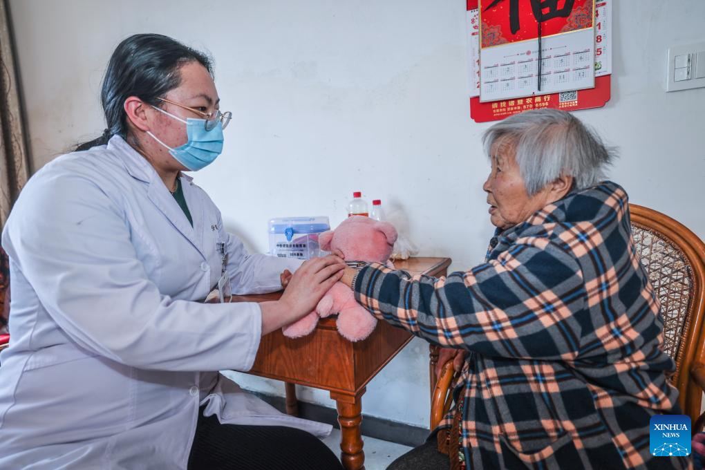 A contracted traditional Chinese medicine (TCM) practitioner from Zhaojia Township clinic provides home-visiting TCM services for a villager in Zhaojia Township, Zhuji, east China's Zhejiang Province, Feb. 18, 2025.