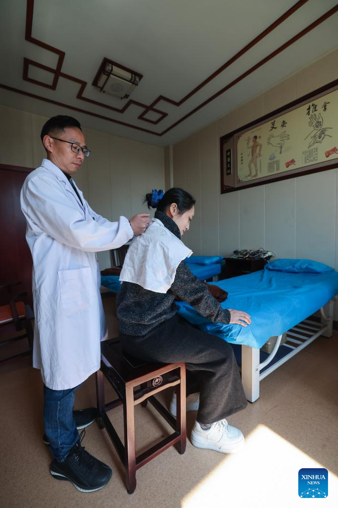 A traditional Chinese medicine (TCM) practitioner provides Tuina treatment, a form of TCM therapeutic massage, to a patient at a clinic in Zhaojia Township, Zhuji, east China's Zhejiang Province, Feb. 18, 2025.