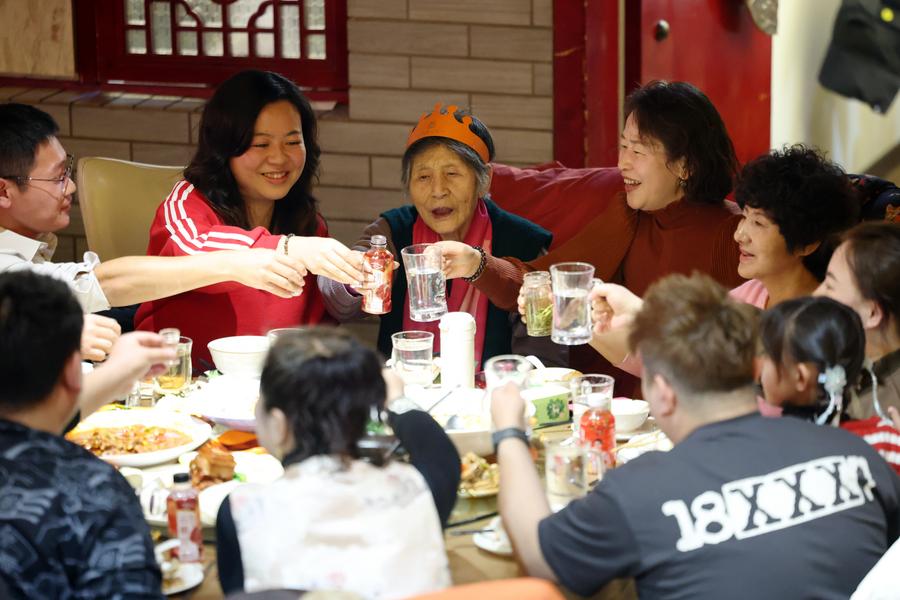 People have a reunion meal at a restaurant in Lanzhou City, northwest China's Gansu Province, Jan. 28, 2025. (Xinhua/Chen Bin)