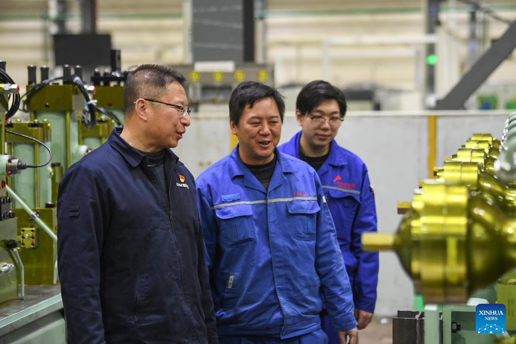 Fu Guotao (L) communicates with colleagues at the workshop of Chongqing Hongjiang Machinery Co., Ltd. in Chongqing, southwest China, Feb. 11, 2025. (Xinhua/Wang Quanchao)