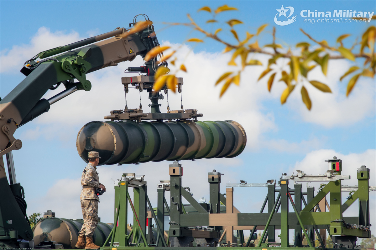 Soldiers assigned to a surface-to-air missile unit with the air force under the Chinese PLA Eastern Theater Command hoist and load surface-to-air missile onto a missile launching truck during a comprehensive training exercise on February 7, 2025. (eng.chinamil.com.cn/Photo by Liang Hongwei)