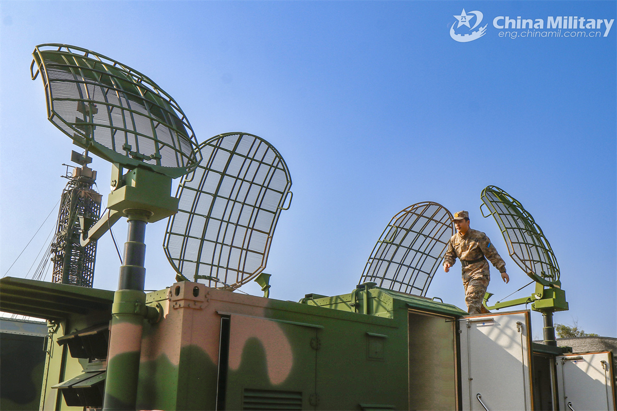 A soldier assigned to a surface-to-air missile unit with the air force under the Chinese PLA Eastern Theater Command prepares the tropospheric scatter communication system for a comprehensive training exercise on February 7, 2025. (eng.chinamil.com.cn/Photo by Li Yonghao)