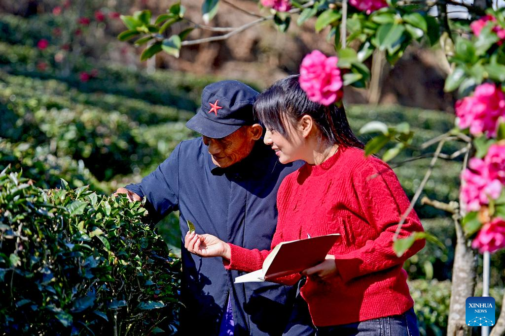 Lu Lihua (R) conducts a survey on the tea industry at a tea factory in Gonglang Town in Nanjian Yi Autonomous County, southwest China's Yunnan Province, Feb. 17, 2025. (Photo by Shi Zhihong/Xinhua)