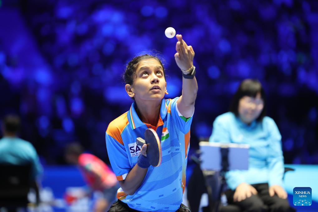 Sreeja Akula of India serves during the women's singles group 1 match against Sreeja Akula of India at the 34th ITTF-ATTU Asian Cup table tennis tournament in Shenzhen, south China's Guangdong Province, Feb. 20, 2025. (Xinhua/Liang Xu)