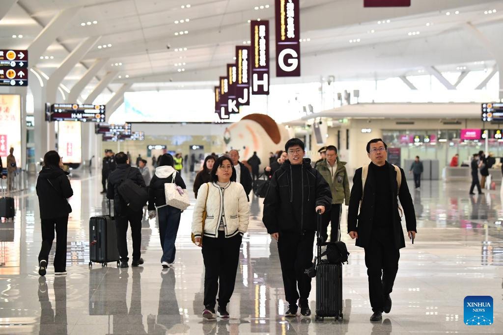 People walk at the departure hall of Terminal 5 of Xianyang International Airport in Xi'an, capital of northwest China's Shaanxi Province, Feb. 20, 2025. The Terminal 5 of the Xianyang International Airport was officially put into operation on Thursday. Covering an area of 705,500 square meters, which is bigger than the total areas of the T1, T2 and T3 terminals, Terminal 5 allows the same floor departure of domestic and international passengers. It also sets up a museum to display cultural relics unearthed in Shaanxi. (Xinhua/Shao Rui)