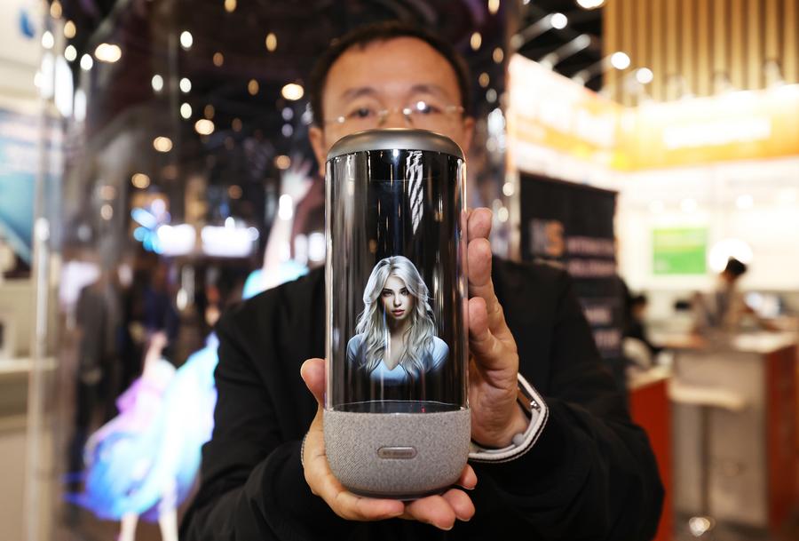 A visitor experiences an AI-driven native language communication device during the 21st China-ASEAN Expo at Nanning International Convention and Exhibition Center in Nanning, south China's Guangxi Zhuang Autonomous Region, Sept. 25, 2024. (Xinhua/Zhang Ailin)