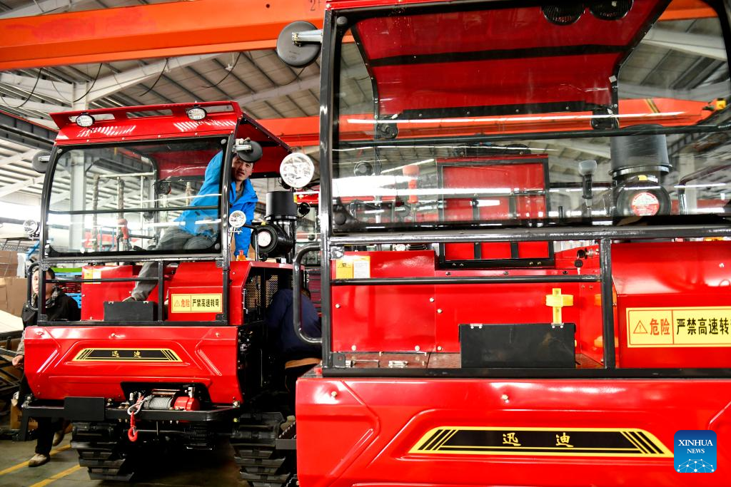 Staff work in the crawler harvester production workshop of Rizhao Liying Machinery Manufacturing Co., Ltd in Rizhao, east China's Shandong Province, Feb. 22, 2025. In recent years, local authorities in Rizhao have made efforts to assist traditional advantageous industries in innovating and develop an array of emerging and future-oriented industries. (Xinhua/Guo Xulei)