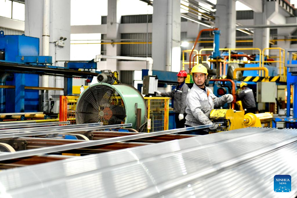 Staff process the products in Shandong Xingchen Aluminum Technology Co., Ltd. in Rizhao, east China's Shandong Province, Feb. 22, 2025. In recent years, local authorities in Rizhao have made efforts to assist traditional advantageous industries in innovating and develop an array of emerging and future-oriented industries. (Xinhua/Guo Xulei)