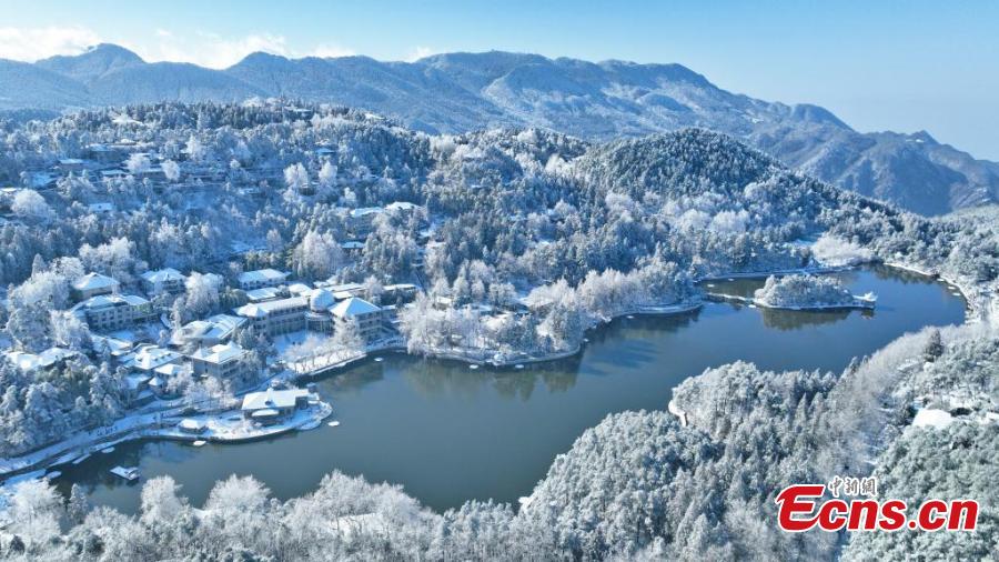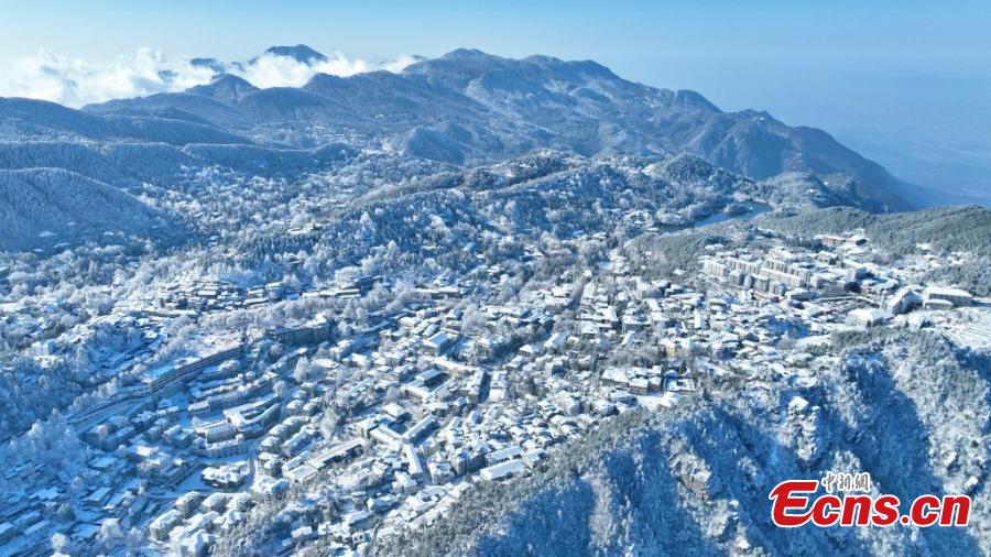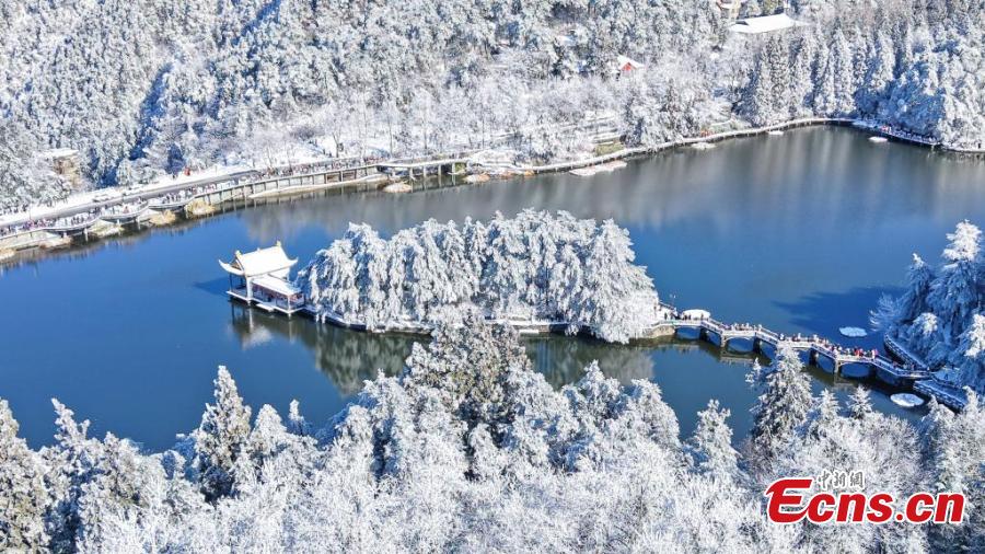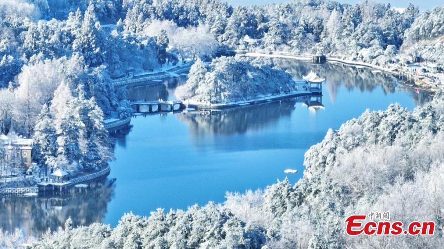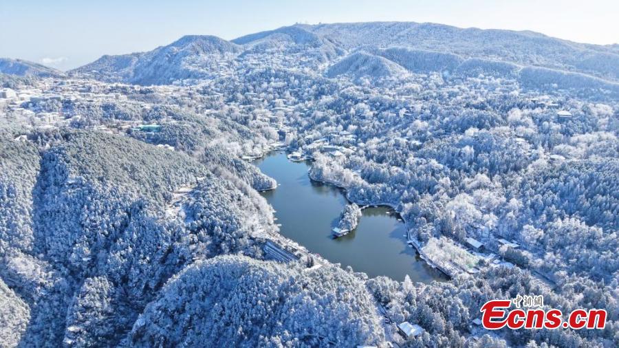 Snow blankets Lushan Mountain in a pristine white while the trees are adorned with delicate icicles, transforming the Lushan Mountain scenic spot, a UNESCO World Heritage site, into a white wonderland in east China's Jiangxi Province. (China News Service/Cheng Peng)