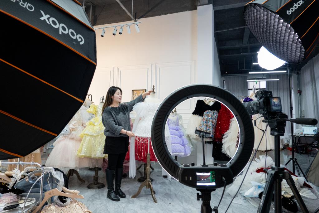 A livestreamer sells children's formal dresses on the short-video platform Douyin in Dingji township, Lu'an city, east China's Anhui Province. (Xinhua/Zhao Jinzheng)