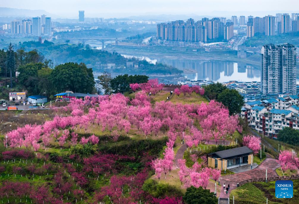 A drone photo taken on Feb 23, 2025 shows plum blossoms at a park in Guang'an District, Guang'an City, southwest China's Sichuan Province. (Photo by Zhang Guosheng/Xinhua)