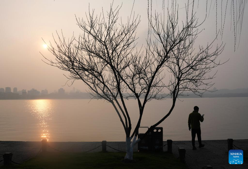 Tourists walk on the Bai Causeway of the West Lake in Hangzhou, east China's Zhejiang Province, Feb. 24, 2025. In early spring, red plum blossoms and the willows in bloom at the West Lake scenic area in Hangzhou attracted numerous tourists. (Xinhua/Han Chuanhao)