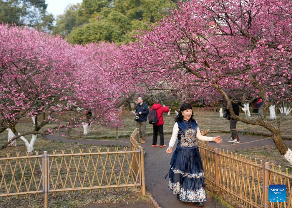 Tourists enjoy the plum blossoms at a park in the Gushan Hill by the West Lake in Hangzhou, east China's Zhejiang Province, Feb. 24, 2025. In early spring, red plum blossoms and the willows in bloom at the West Lake scenic area in Hangzhou attracted numerous tourists. (Xinhua/Han Chuanhao)