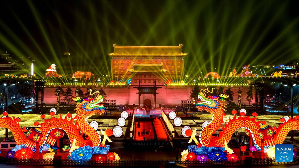 An aerial drone photo shows tourists visiting the Grand Tang Mall in Xi'an, northwest China's Shaanxi Province, Feb. 2, 2024. As the provincial capital of northwest China's Shaanxi Province, Xi'an, with a history of over 3,100 years, has served as the capital city for 13 dynasties of China. Under the policies of protection and utilization of cultural relics, the historical and cultural resources of Xi'an have been well preserved. (Xinhua/Shao Rui)