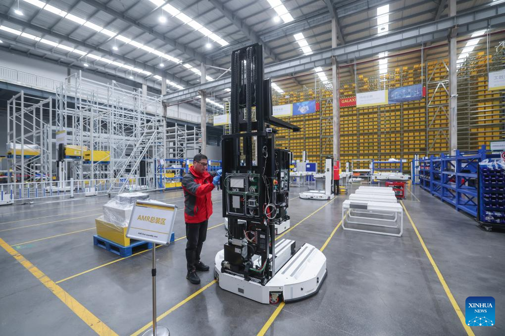 Employees work at the assembly area of shuttles in Galaxis Technology in Nanhu District of Jiaxing, east China's Zhejiang Province, Feb. 25, 2025. Local authorities in Nanhu District have continuously implemented diversified measures in recent years to address enterprises' demands, improve business environment, and promote healthy, high-quality development of private economy. (Xinhua/Xu Yu)