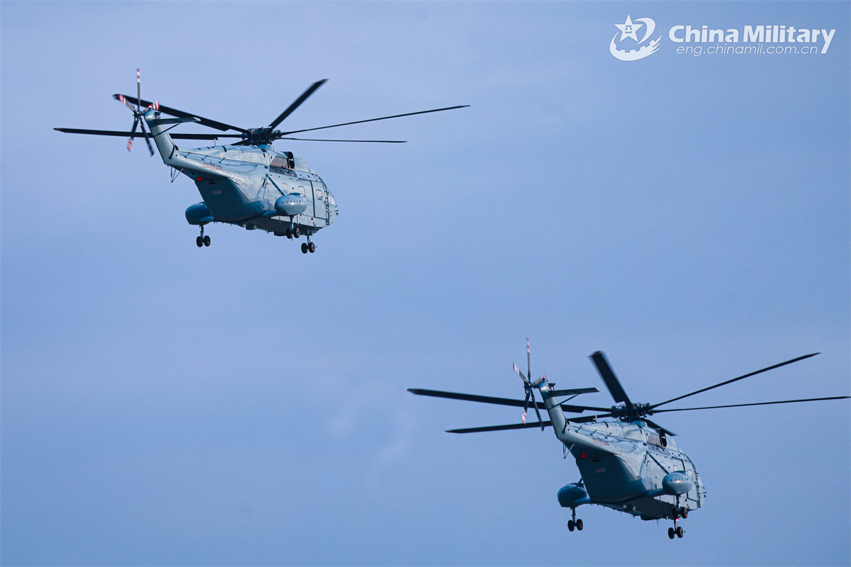 Z-8 helicopters attached to a naval aviation regiment under the Chinese PLA Southern Theater Command fly towards the designated air space during a flight training exercise. (eng.chinamil.com.cn/Photo by Feng Lin)