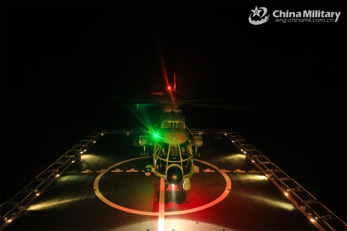 A Z-8 helicopter attached to a naval aviation regiment under the Chinese PLA Southern Theater Command lands on the flight deck during a night flight training exercise. (eng.chinamil.com.cn/Photo by Feng Lin)