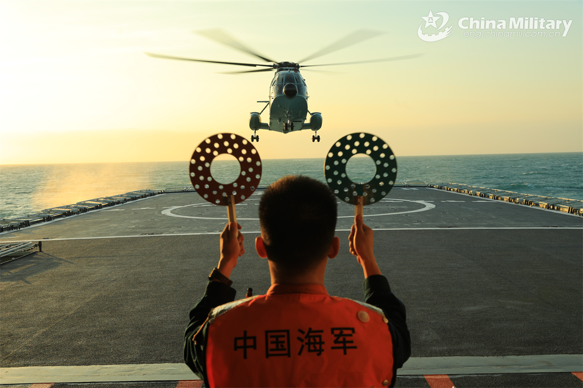 A crew member assigned to a naval aviation regiment under the Chinese PLA Southern Theater Command signals a Z-8 helicopter to land on the flight deck during a flight training exercise. (eng.chinamil.com.cn/Photo by Feng Lin)