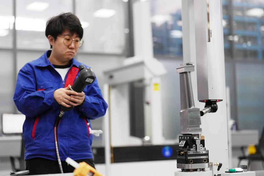 A quality control engineer checks a component with a digital measuring device at a workshop of Harbin Turbine Company Ltd. in Harbin, northeast China's Heilongjiang Province, Feb. 26, 2025. (Xinhua/Wang Song)